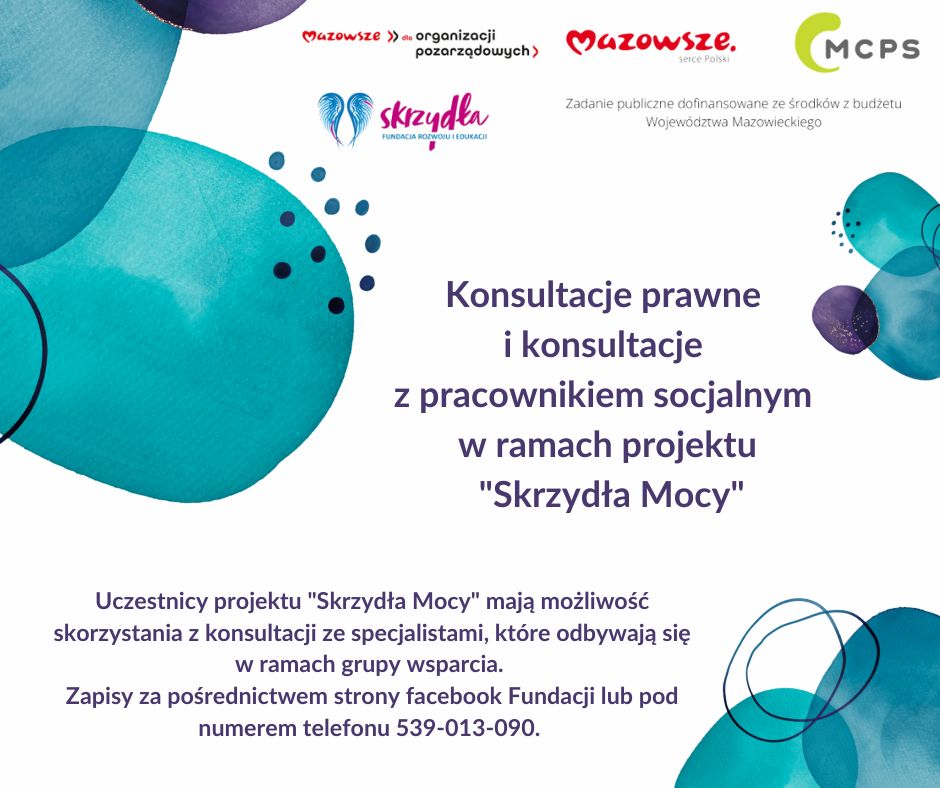 W ramach projektu „Skrzydła Mocy” nasza Fundacja prowadzi konsultacje z prawnikiem i pracownikiem socjalnym. Zapraszamy zakwalifikowanych uczestników do zapisów.